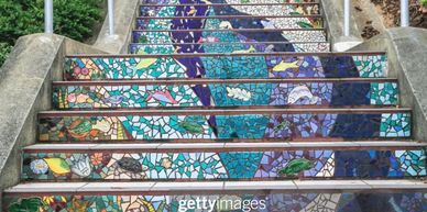 Created by artists Colette Crutcher and Aileen Barr, the 163-step stairway comprises more than 75,000 tile, stained glass, and mirror pieces.